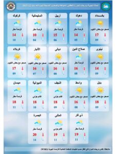 أصدر قسم التنبؤ في الهيئة العامة للأنواء الجوية تقريراً مفصلاً عن حالة الطقس في العراق، مشيراً إلى تقلبات جوية تمتد لعدة أيام، تتراوح بين الصحو والغائم جزئياً، مع فرص لهطول زخات مطر خفيفة وتشكل الضباب في عدد من المناطق، ولاسيما خلال ساعات الصباح الباكر.
